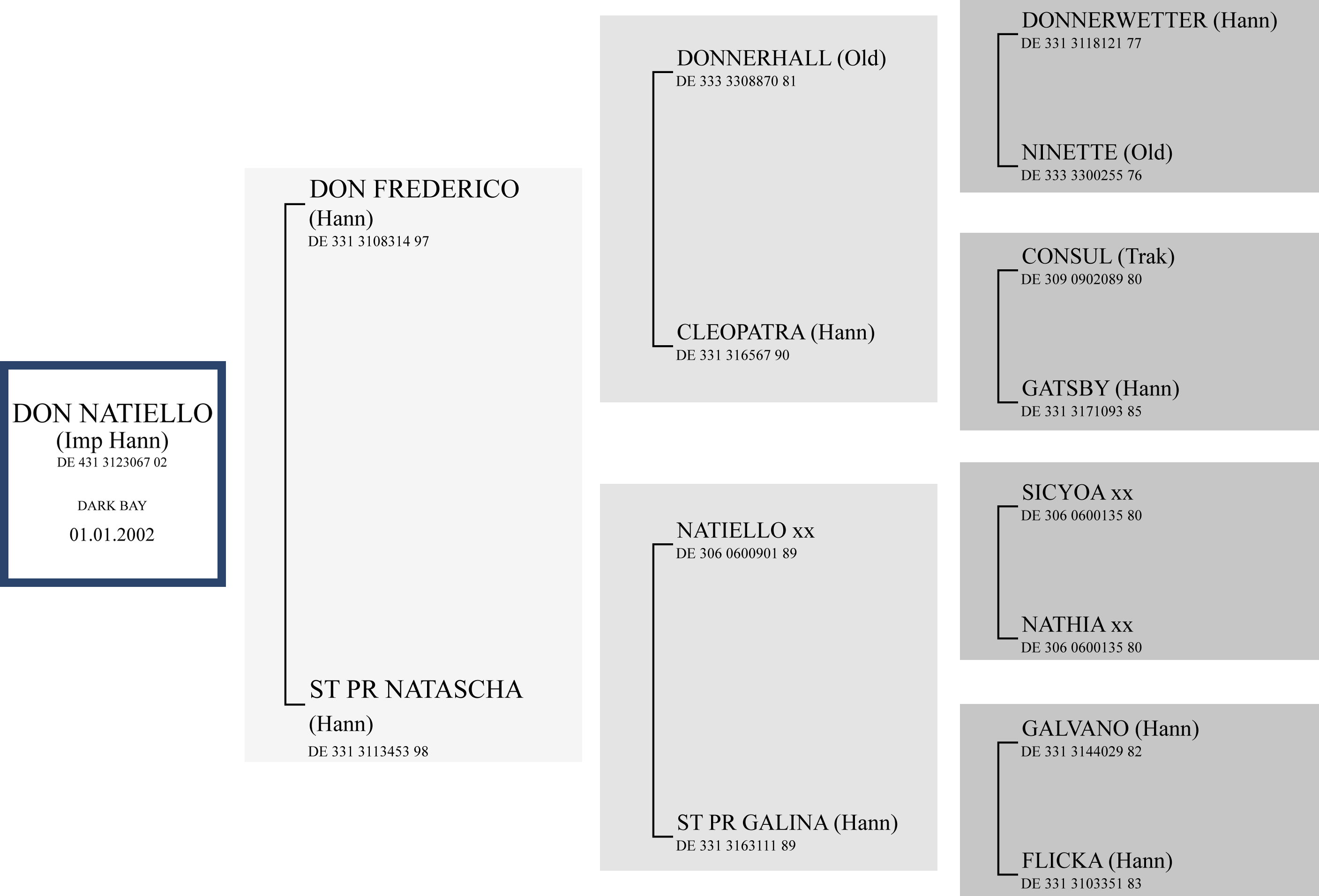 Natiello xx was a Thoroughbred stallion used within the Hanoverian breed for his temperament, rideability and rhythmical walk and trot. Galvano is by the famous sire Grande - a stallion that produced umpteen dressage and jumping horses.