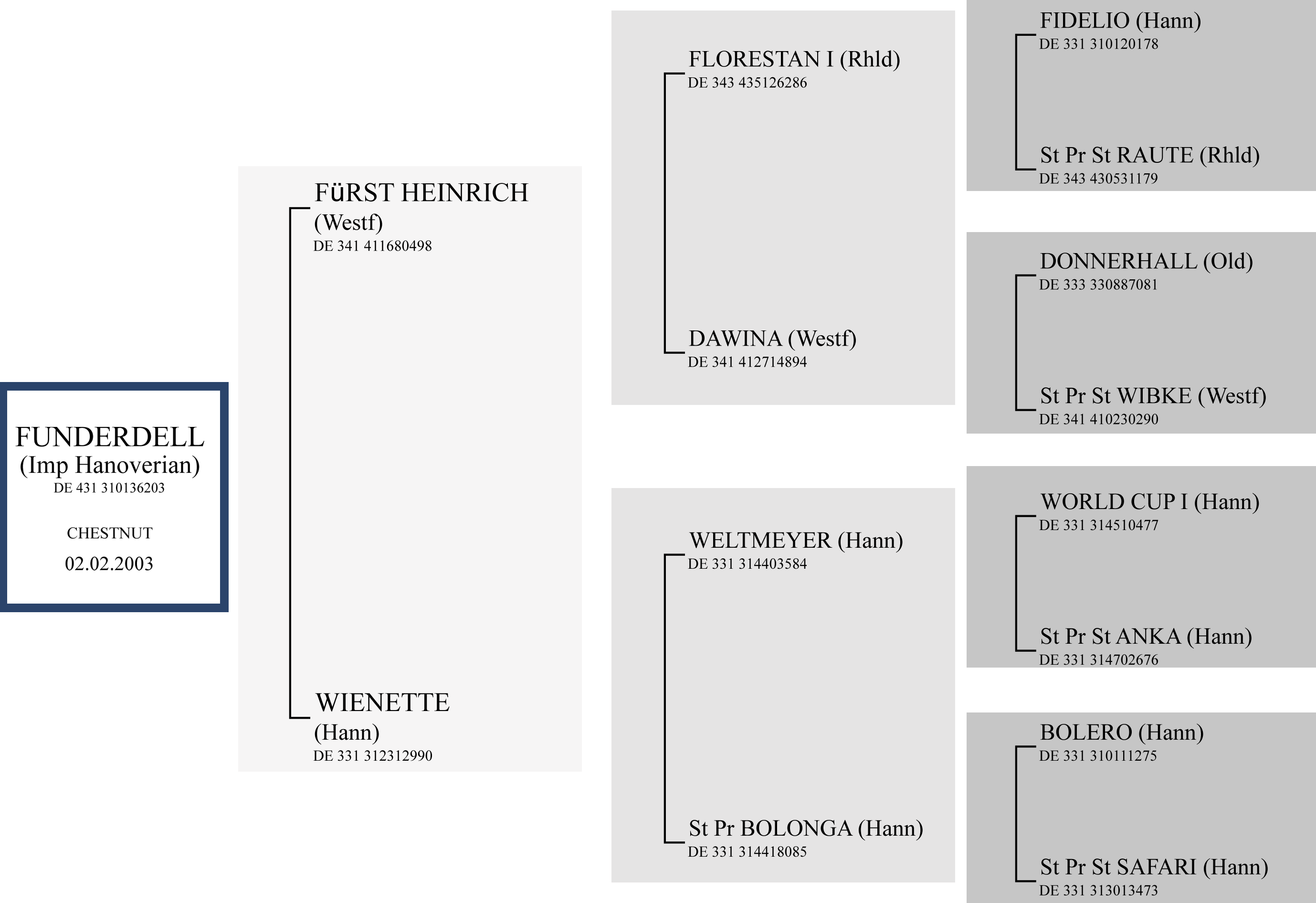 Funderdell (Reference Stallion)'s dam line combined with his sire's pedigree is seen in many of top European competition dressage horses. Weltmeyer was possibly one of the best known dressage stallions of our time. To date he has produced over 92 licensed stallions, and 250 State Premium mares. He won his stallion licensing, the performance test, the Federal Championship and the DLG exhibition. He also trained up to Grand Prix level as part of the State Stud in Celle.